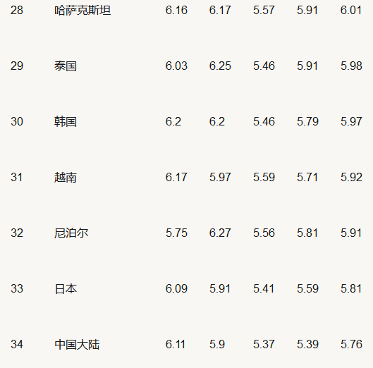 2017年全球雅思A類(lèi)考試平均成績(jì)Top40排名中,中國大陸地區以總成績(jì)平均分5.76分位居34名,日本、韓國、泰國和越南雅思總成績(jì)平均分均比中國大陸總成績(jì)平均分排名靠前。