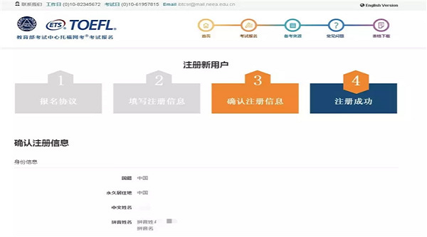 新考試需要經(jīng)過(guò)四個(gè)步驟:報名協(xié)議——填寫(xiě)注冊信息——確認注冊信息——注冊成功